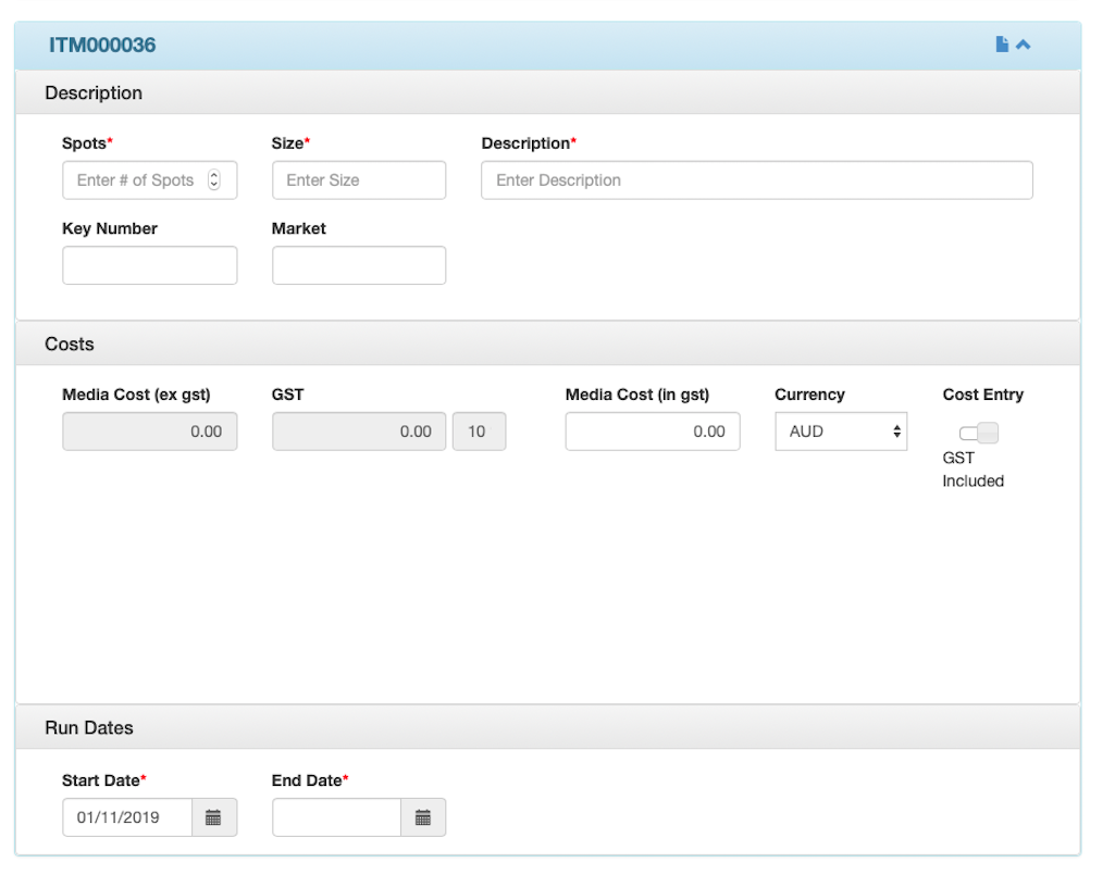 Enter the Media Cost for the item. You can switch between Inclusive and Exclusive GST via the Cost Entry button.